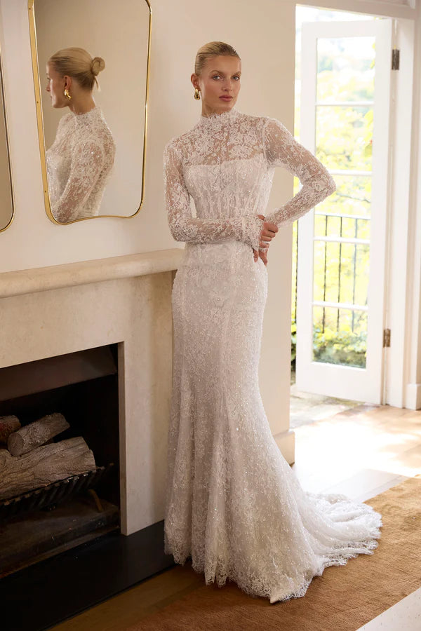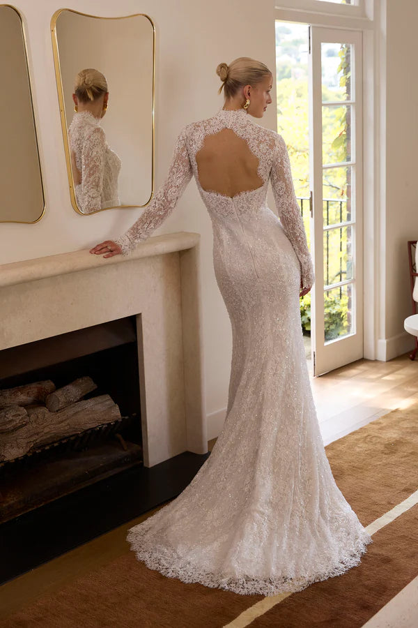The gown features a timeless high-neck, long-sleeve mermaid silhouette, offering both refinement and grace. The delicately open back provides just the right amount of skin exposure, maintaining an air of subtle sensuality. This design beautifully enhances the waist-to-hip curves, evoking a sense of vintage glamour. The inner bodice is shaped with a small U-neckline, adding a contemporary touch with a soft, inclusive curve for comfort and style.