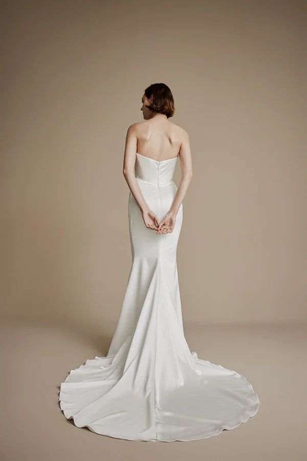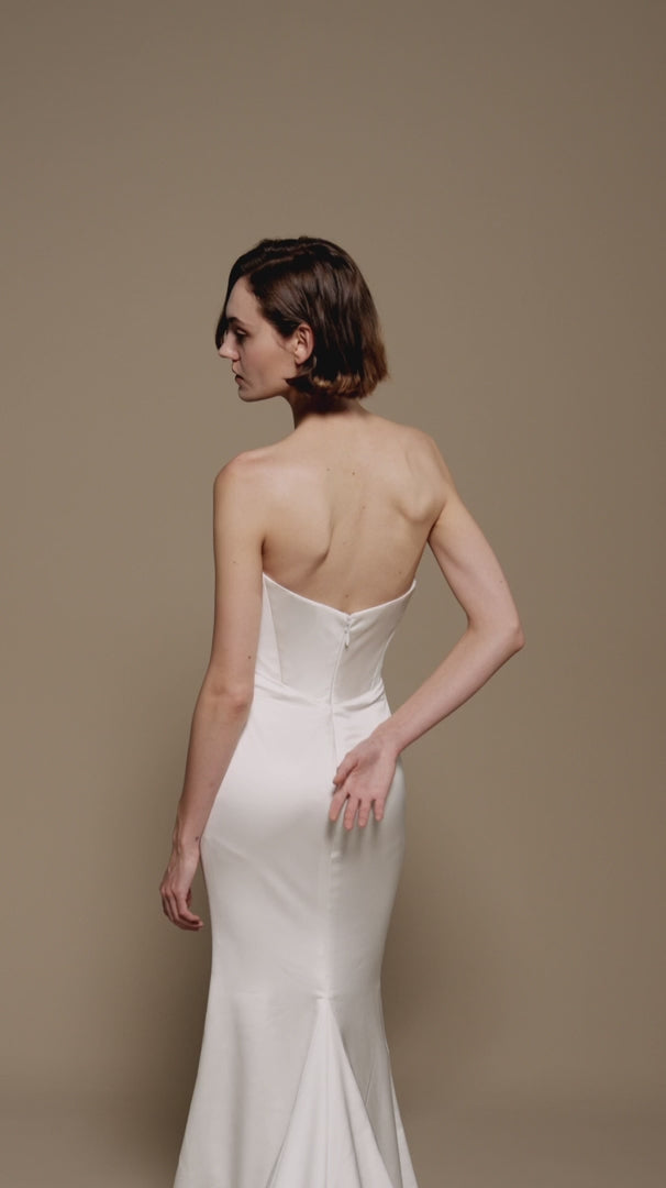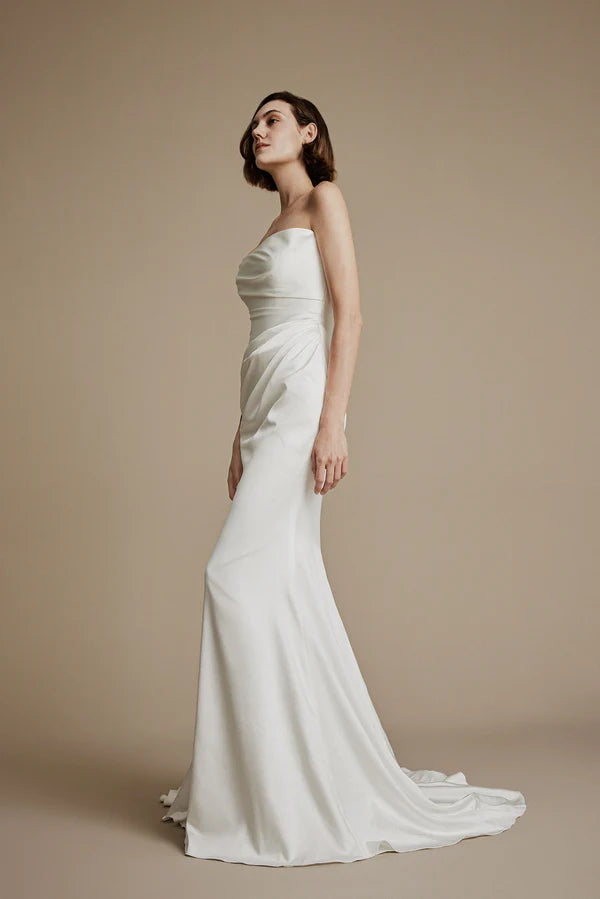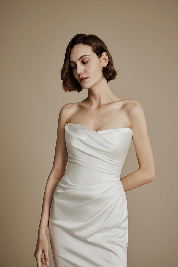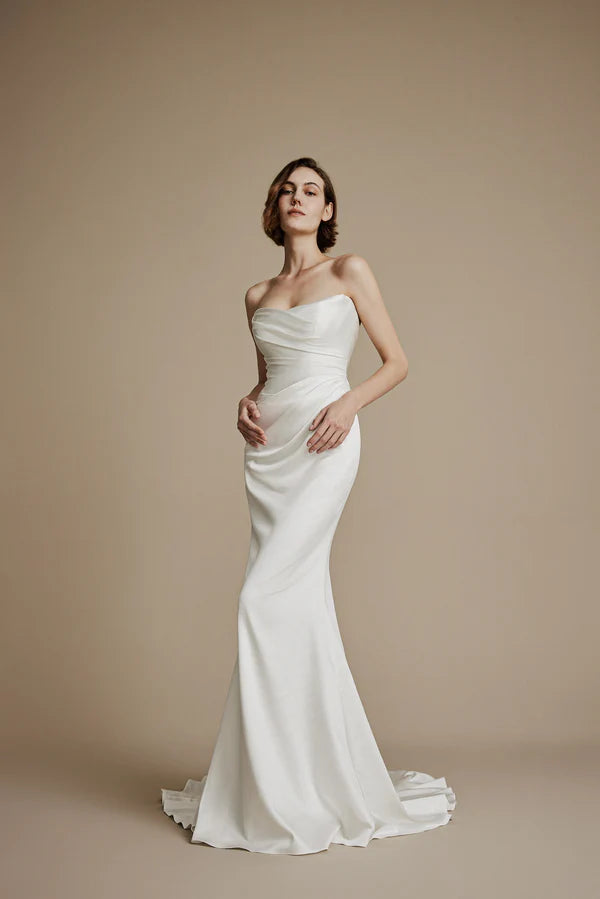 Cypress showcases sculptural draping executed directly on the mannequin for couture precision. Soft satin with a subtle sheen flows to elongate the silhouette, while discreet boning creates structure and a slimming effect. A thoughtfully designed bust ensures comfort and support, balancing modern sophistication with timeless elegance.