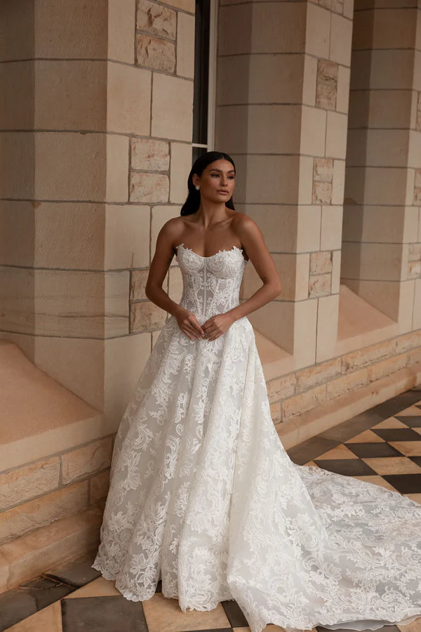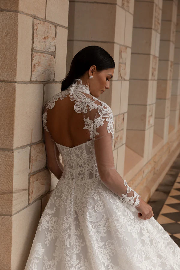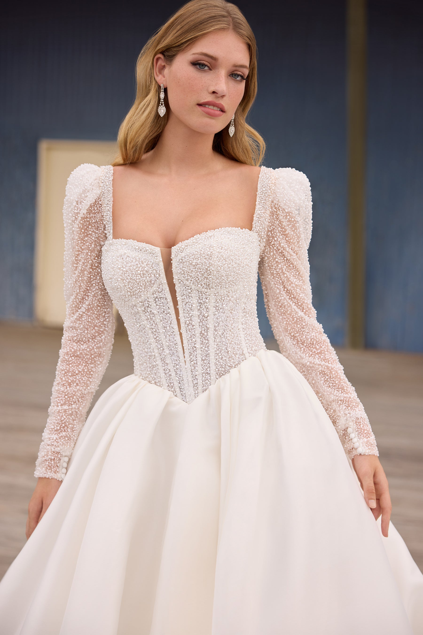 Make a royal statement in our enchanting ball gown, Melody. Her dramatic silhouette parallels the ball gowns worn by your favorite fairytale princesses! Featuring a semi-sheer beaded corset bodice with a sweetheart neckline and a subtle peekaboo detail, this gown is the definition of elegance! She comes with detachable beaded sleeves, which have subtle padded shoulders to create a more dramatic look. The sleeves connect with a beaded strap, creating a subtle back detail to make Melody even more romantic. She features a subtle illusion back feature which the modern bride is bound to love. The contrast between her beaded bodice and the voluminous skirt crafted from satin organza is magnificent! Her gorgeous ball gown skirt features pockets and flows into a grand train with buttons. Don't forget to bustle Melody's train when you take the dance floor! With every bead and detail designed to captivate, Melody promises that your bridal look will be unforgettable.