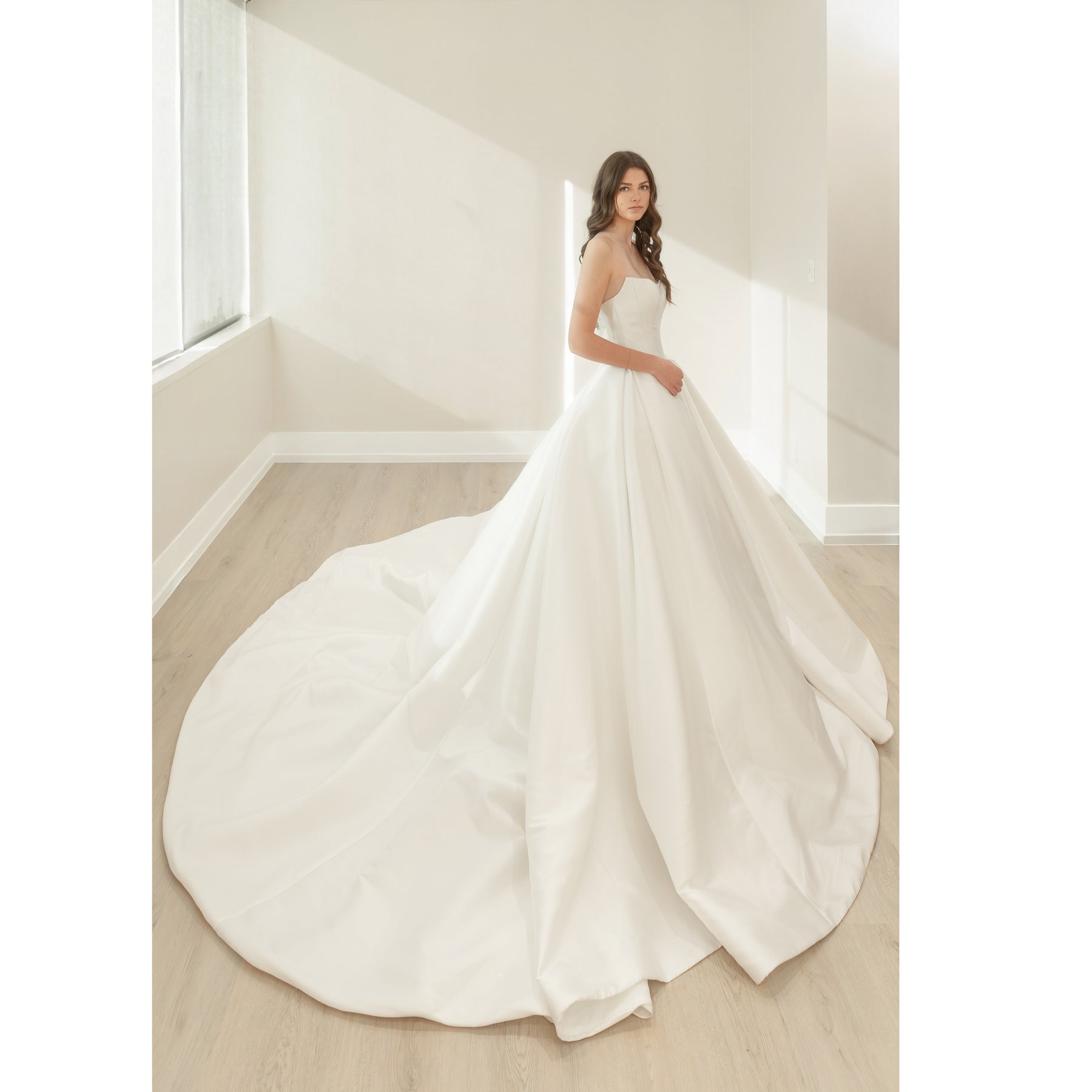 This strapless ball gown is the epitome of minimalist luxury, crafted from luminous structured satin. A sleek square neckline frames the collarbone with quiet elegance, while a tailored corset bodice cinches the waist before flowing into a voluminous skirt with deep pleats. The back features a row of covered buttons leading to a dramatic cathedral train, its smooth fabric catching light to highlight the gown’s clean, sculptural lines. Every detail embodies Magnolia’s ethos—timeless, refined, and effortlessly sophisticated.