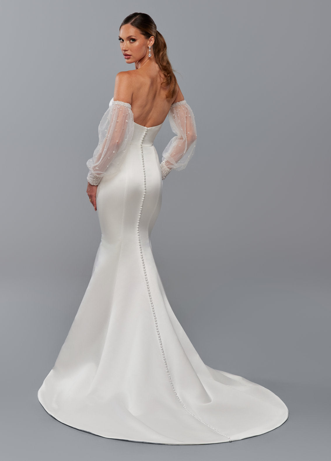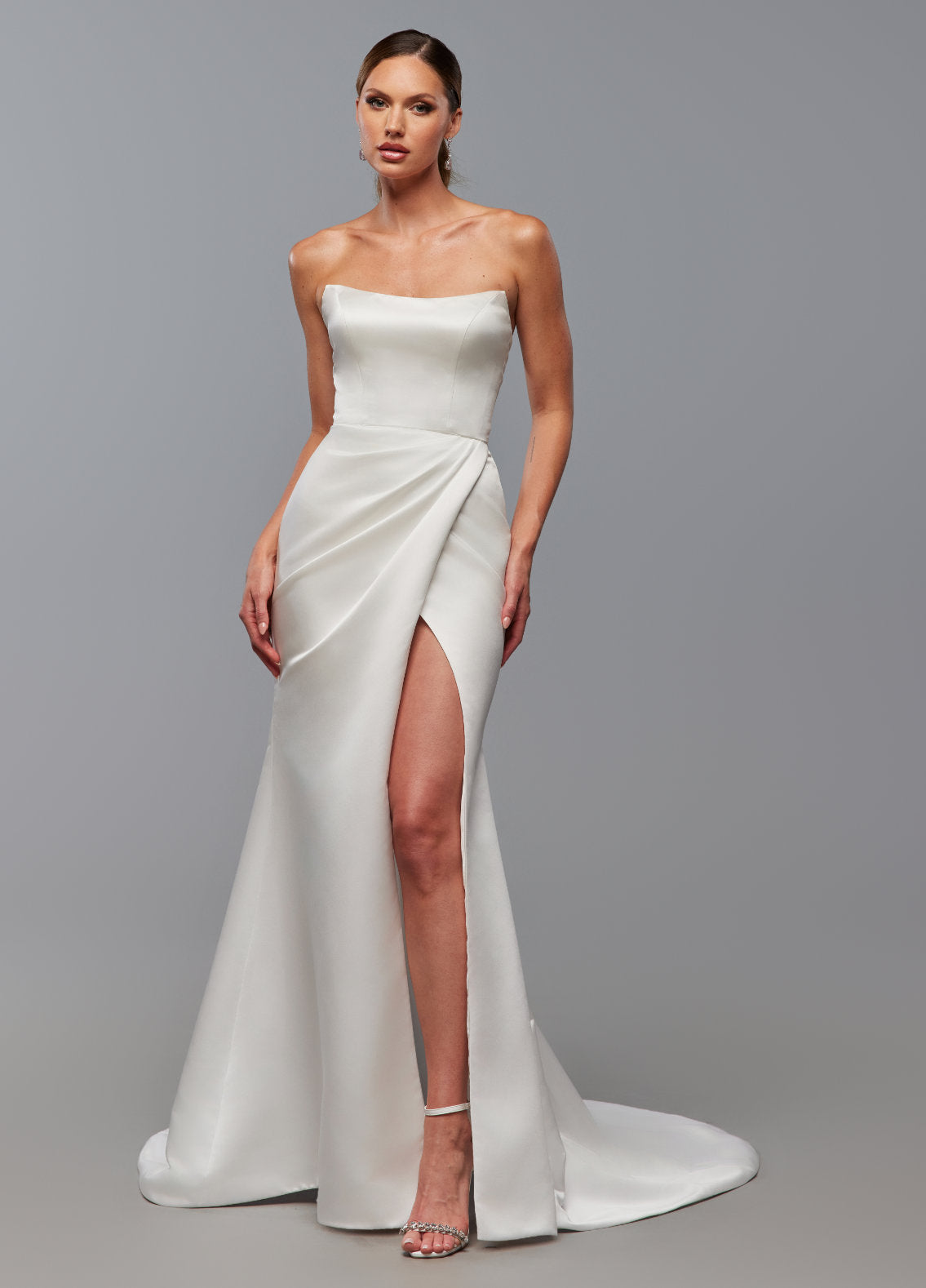 This Ashley & Justin satin wedding dress features a sleek scoop neckline and a flattering fit-and-flare silhouette that enhances your natural shape. Designed for a modern bride, its smooth fabric and elegant cut create a timeless yet contemporary look, perfect for walking down the aisle with confidence and grace.