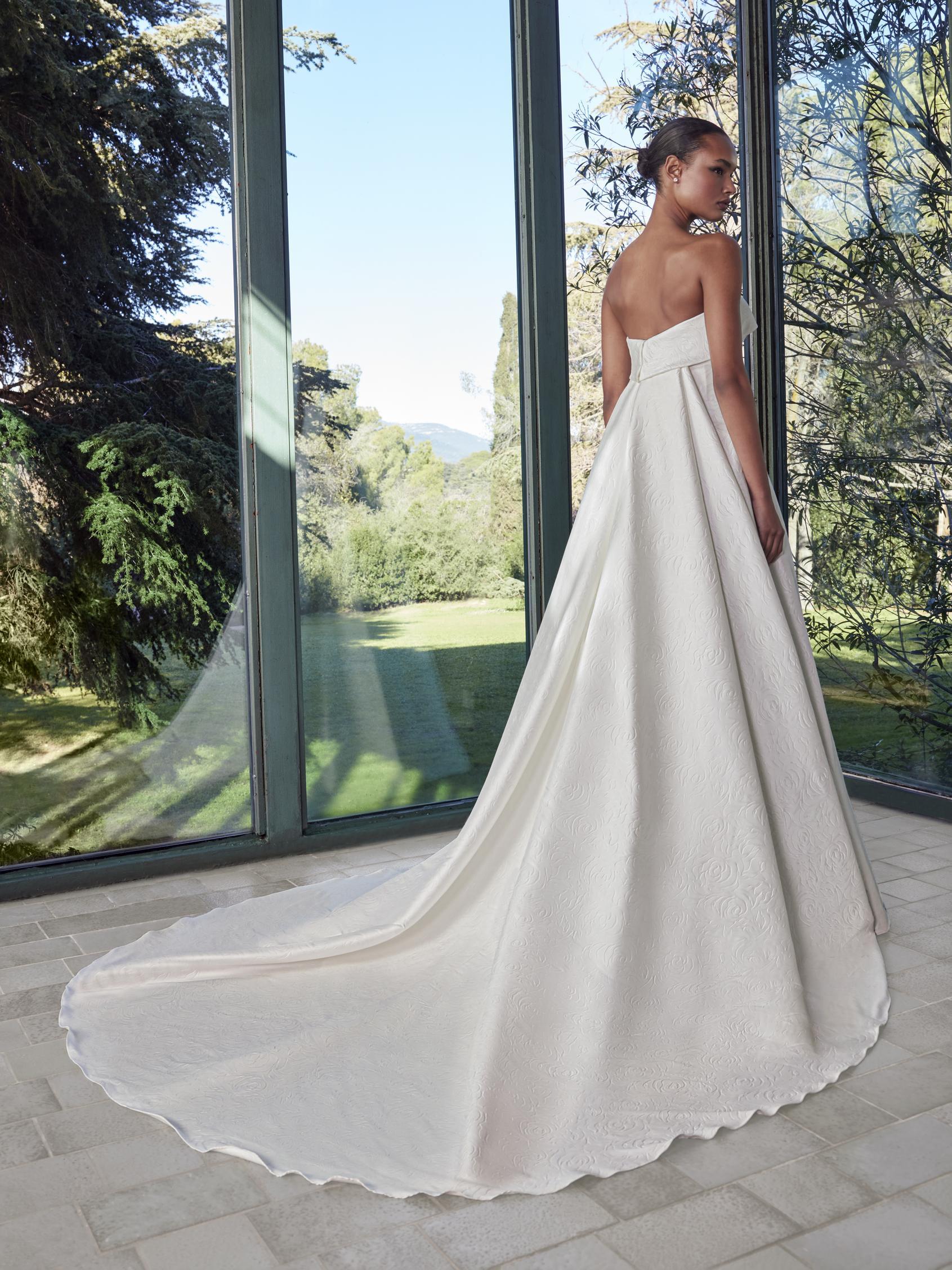 A strapless A-line gown designed for dramatic effect, fashioned in luxurious mikado. Its bold drape and structured silhouette create a commanding presence that elevates traditional bridal glamour.