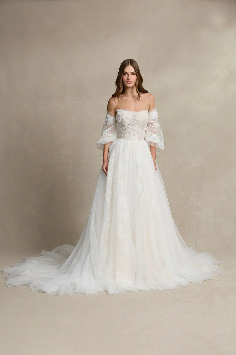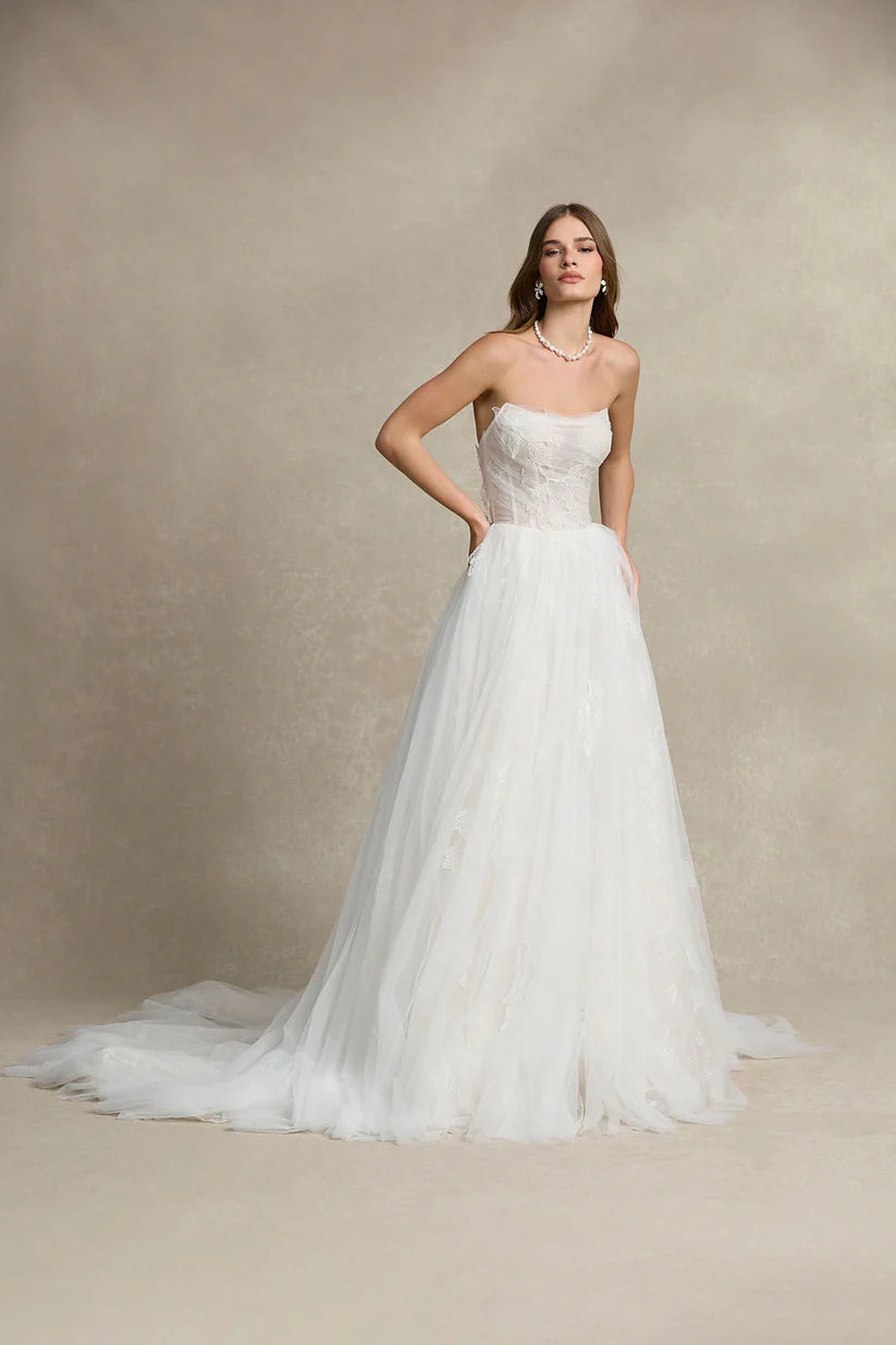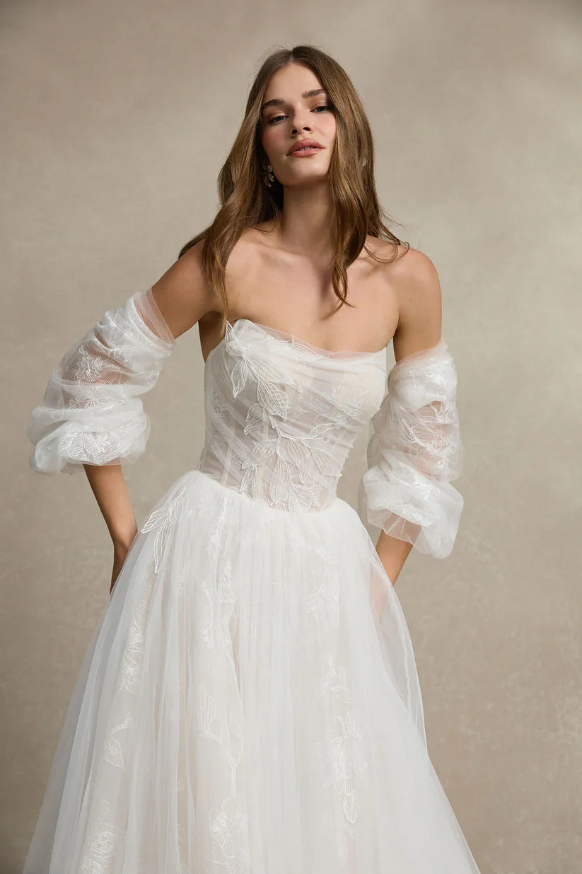 This wedding dress is tailored for brides who seek romance, blending softness with a sense of freedom. The first layer features delicate pleated tulle adorned with scattered leaf-patterned lace appliqués, adding a dynamic touch. Beneath, a soft, smooth underlayer subtly peeks through, harmonizing beautifully with the ruched bodice. The trendy and universally flattering U-shaped neckline enhances the elegance of the design. The gathered detailing on the skirt gracefully extends from the sides to the back, accentuating the silhouette for a refined and feminine look.