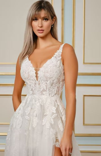 This modern wedding dress features an elegant A-line silhouette that flatters every figure. Its V-neckline adds a touch of sophistication, while the skirt slit offers a subtle hint of allure and ease of movement. Perfect for brides seeking a blend of classic charm and contemporary style.
