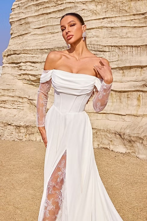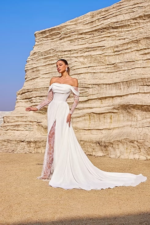 This wedding dress is a stunning fusion of romance and modern elegance. It features an off - the - shoulder neckline with a draped, cowl - like design that gracefully frames the shoulders and collarbone, exuding a soft and alluring charm. The long sleeves are made of delicate lace, adding a touch of intricacy and femininity, while the sheer fabric beautifully showcases the arms. The bodice is structured like a corset, cinching the waist to create a flattering hourglass silhouette. The skirt flows down in a fluid manner, with a high slit that reveals intricate lace detailing underneath, bringing a sense of movement and sensuality. A long, flowing train extends from the back, enhancing the bridal grandeur as the bride moves. Crafted from a combination of smooth, lustrous fabric and delicate lace, the dress balances luxury with delicacy. Set against the backdrop of rugged, natural rock formations, it stands out with its refined beauty, making it an ideal choice for a bride who desires a look that is both timeless and fashion - forward on her special day.