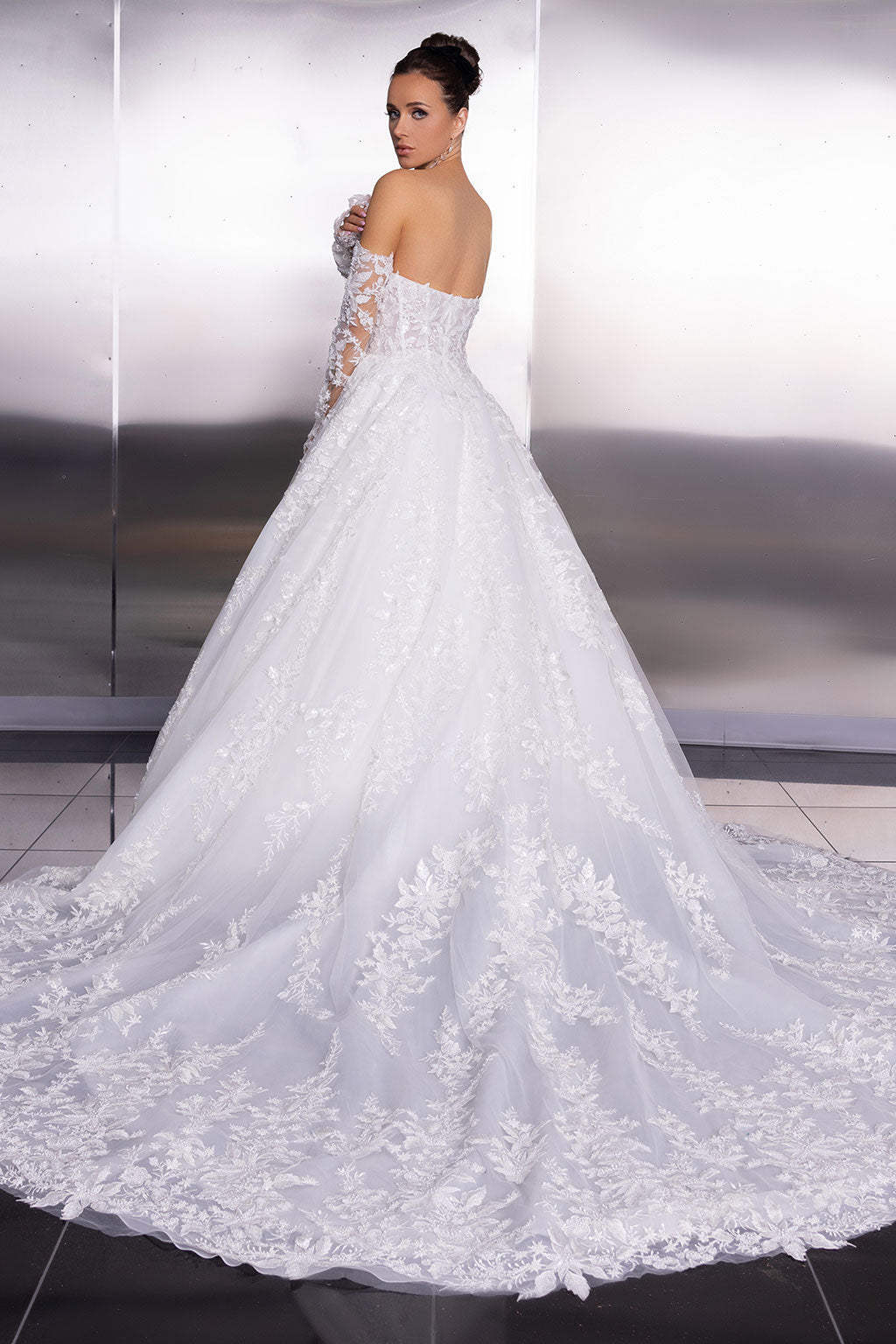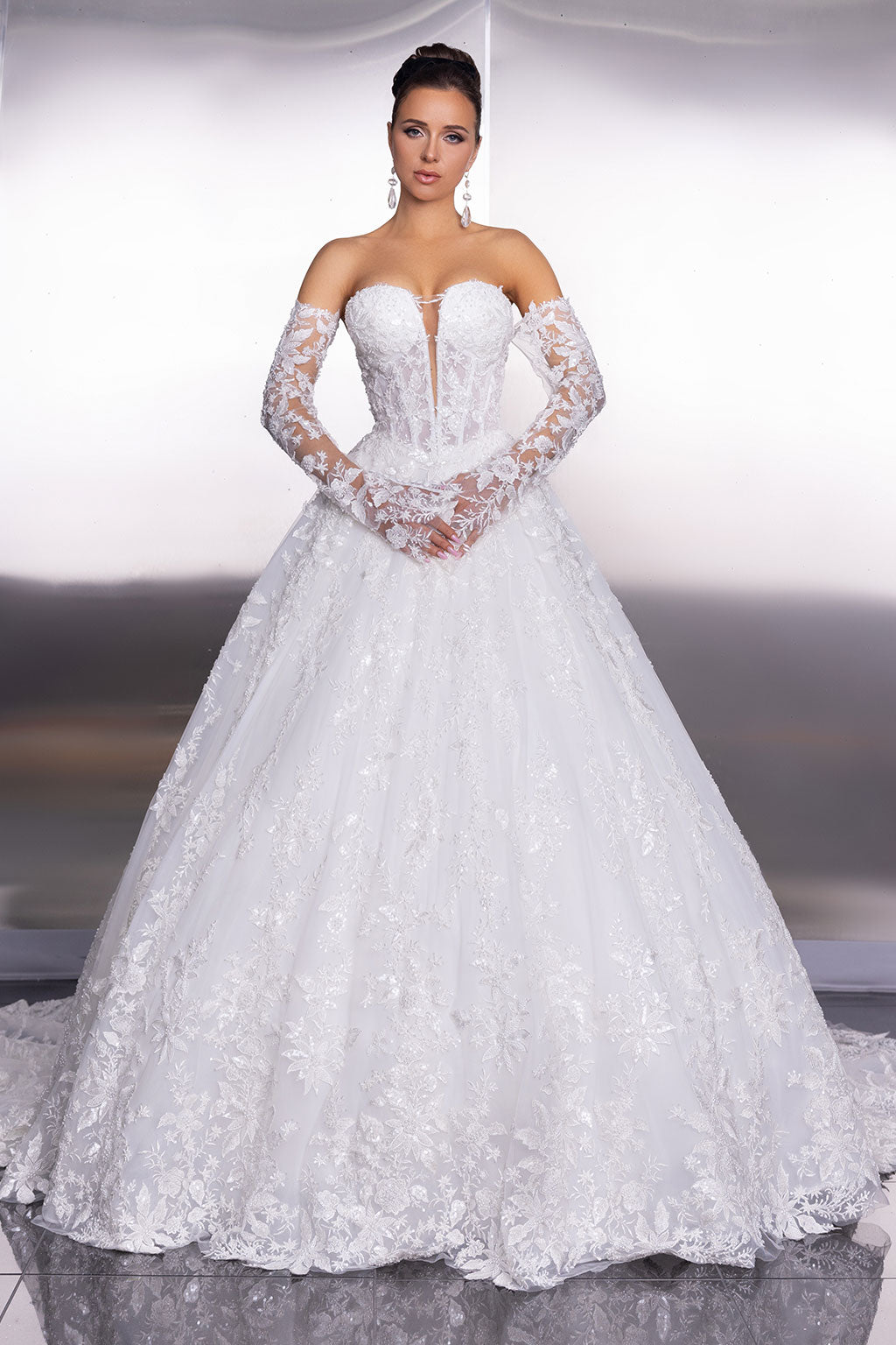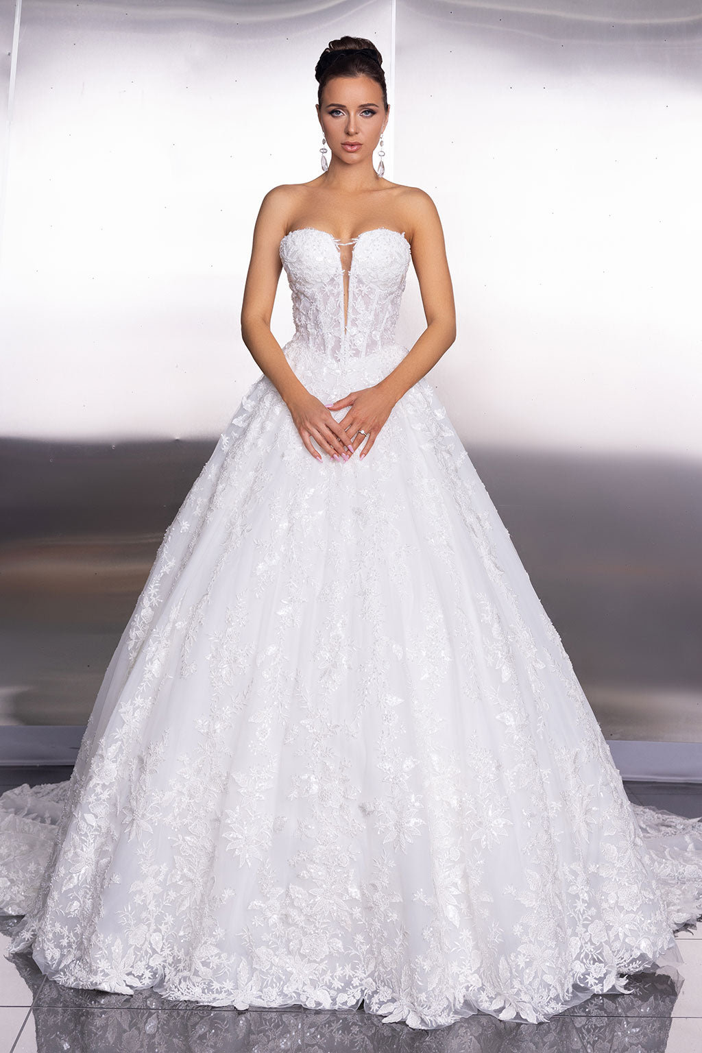 An elegantly modern strapless ball gown featuring a plunging V-neckline and a corseted bodice with a modified basque waist and matching gauntlets. The ball gown skirt is adorned with intricate leaf lace embellishments, culminating in a full chapel train.