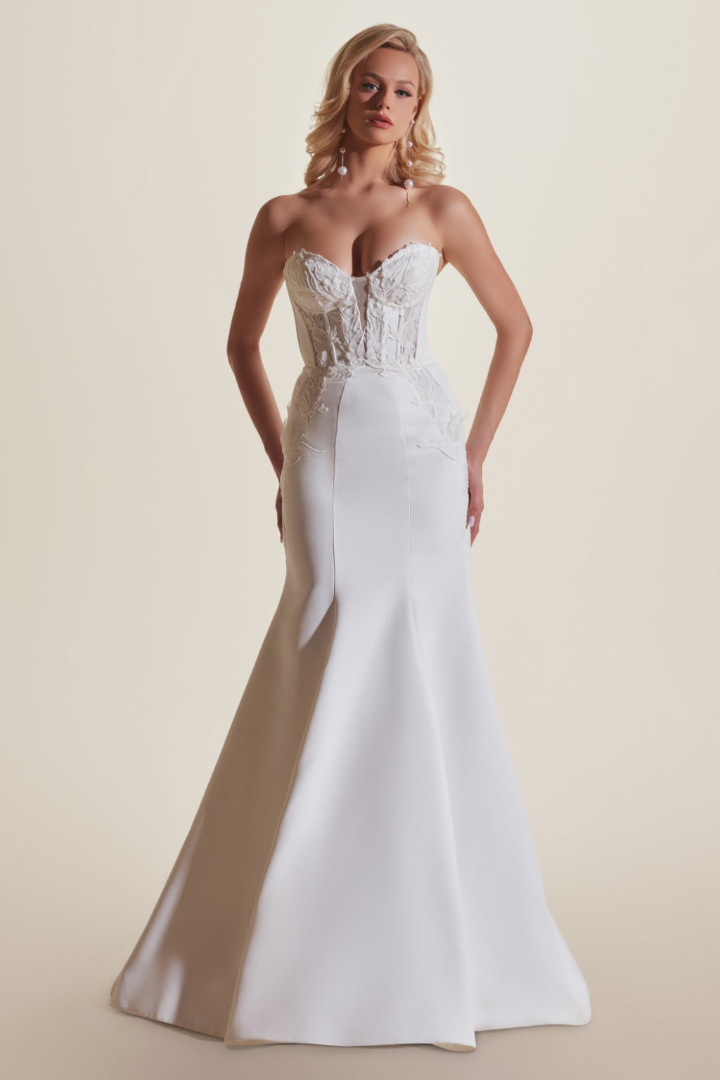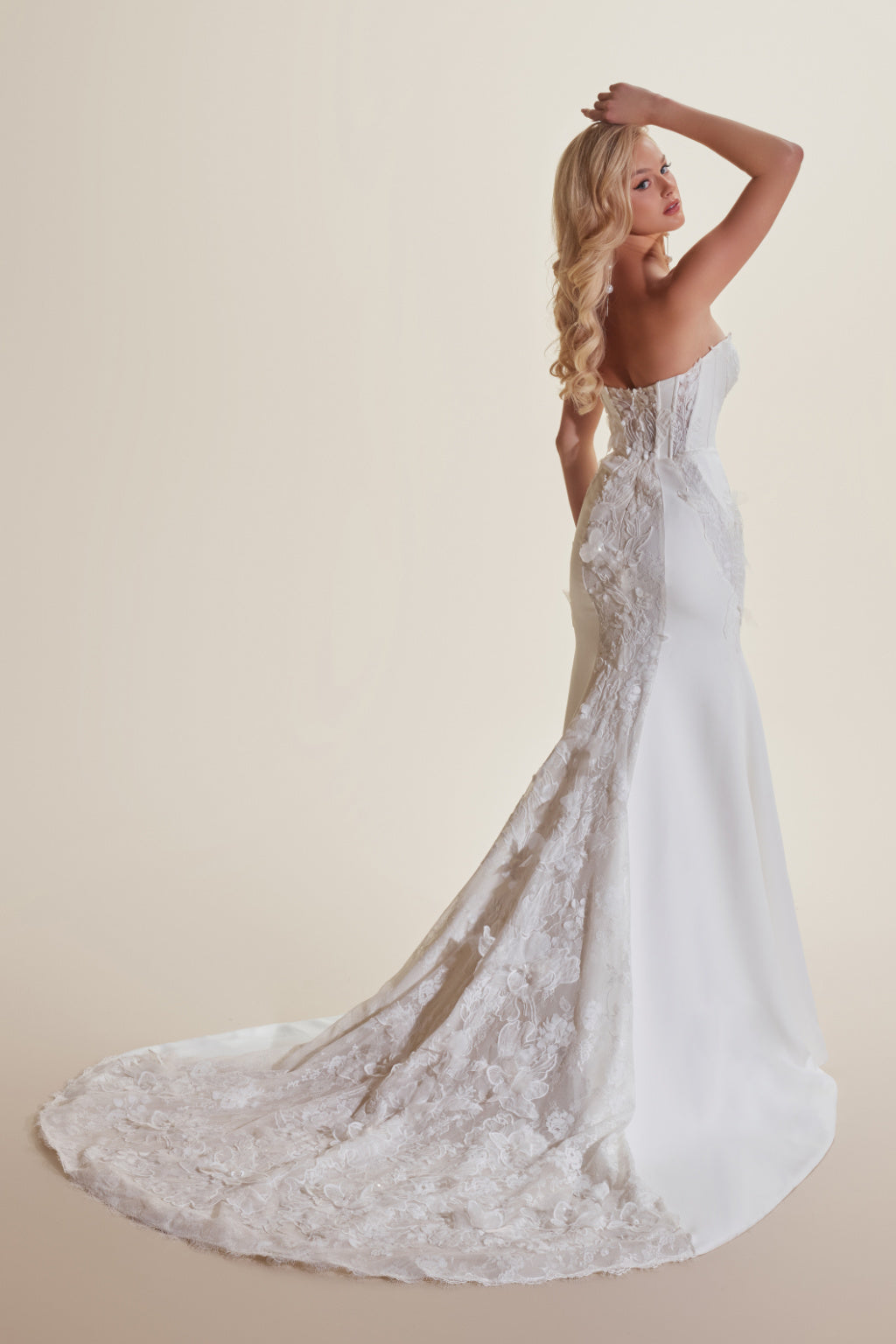 Fashioned from luxurious 4-ply Milano crepe, VANESSA is a sultry fit-and-flare silhouette that shimmers with hand embellished 3D lace and crystallized tulle. The bodice captivates with its intricate detailing and a dramatic yet demure plunging sweetheart neckline. An optional chic neck scarf adds a final touch of effortless elegance, completing a vision of modern sophistication and timeless allure.