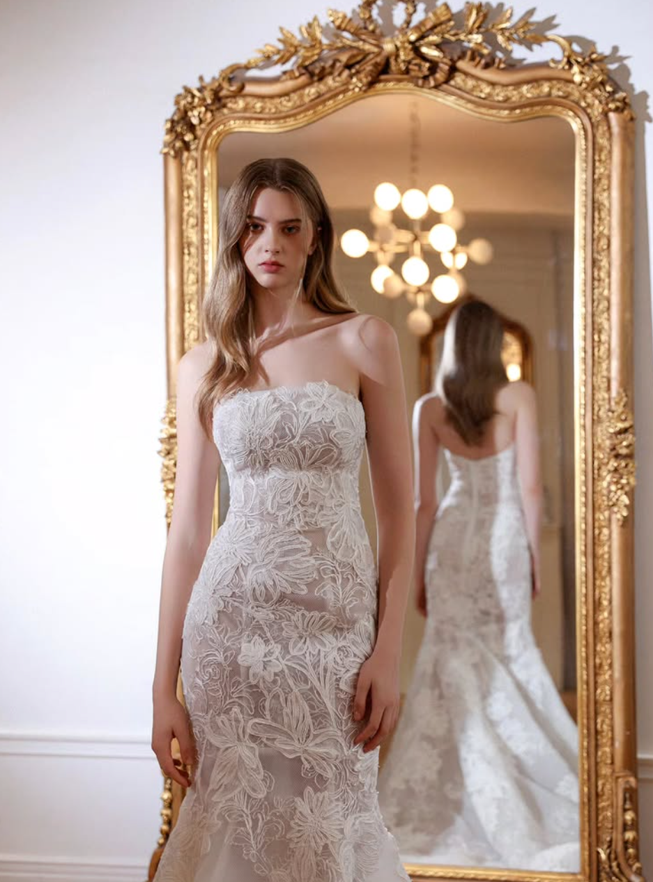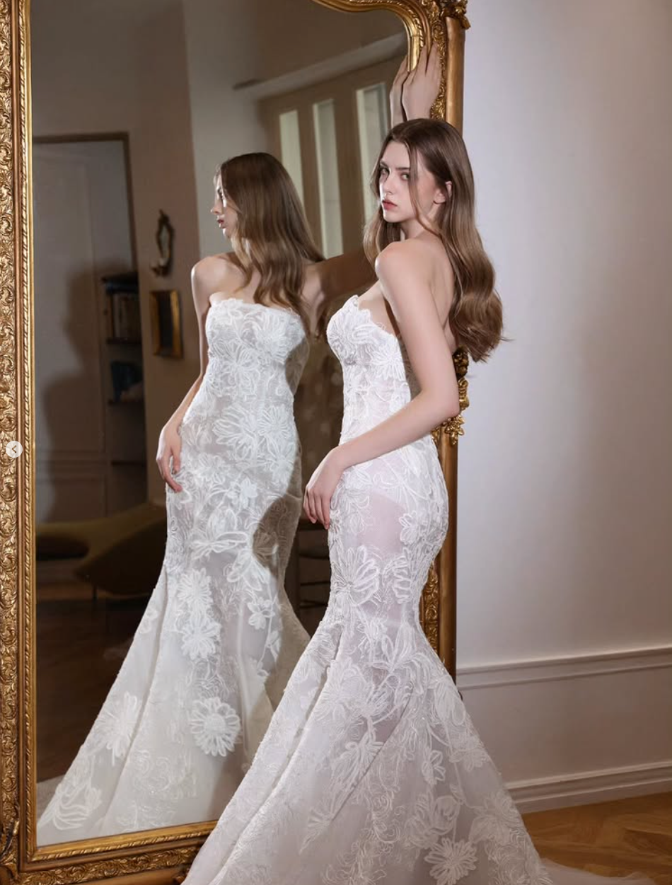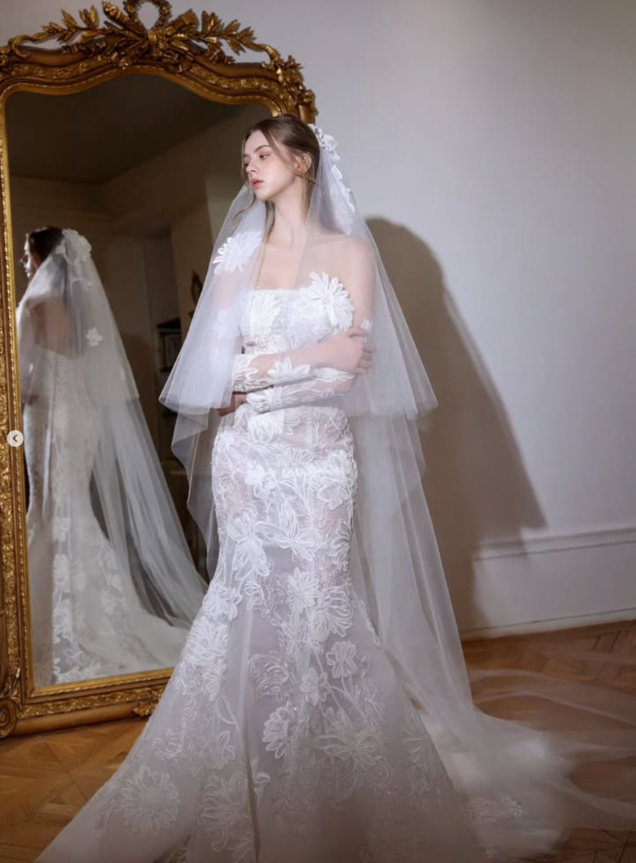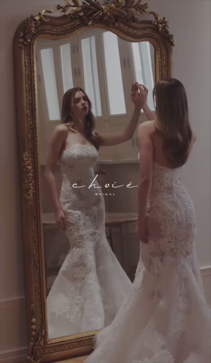 This strapless mermaid gown is a testament to Choie’s artisanal romance, crafted from sheer tulle adorned with hand-appliquéd 3D floral lace. The structured bodice hugs the torso before flaring into a dramatic floor-length train, while the sweetheart neckline frames the décolletage with soft, scalloped edges. Available in ivory, it can be styled with delicate long lace sleeves for added elegance. Every stitch embodies Choié’s ethos—timeless, feminine, and utterly romantic.
