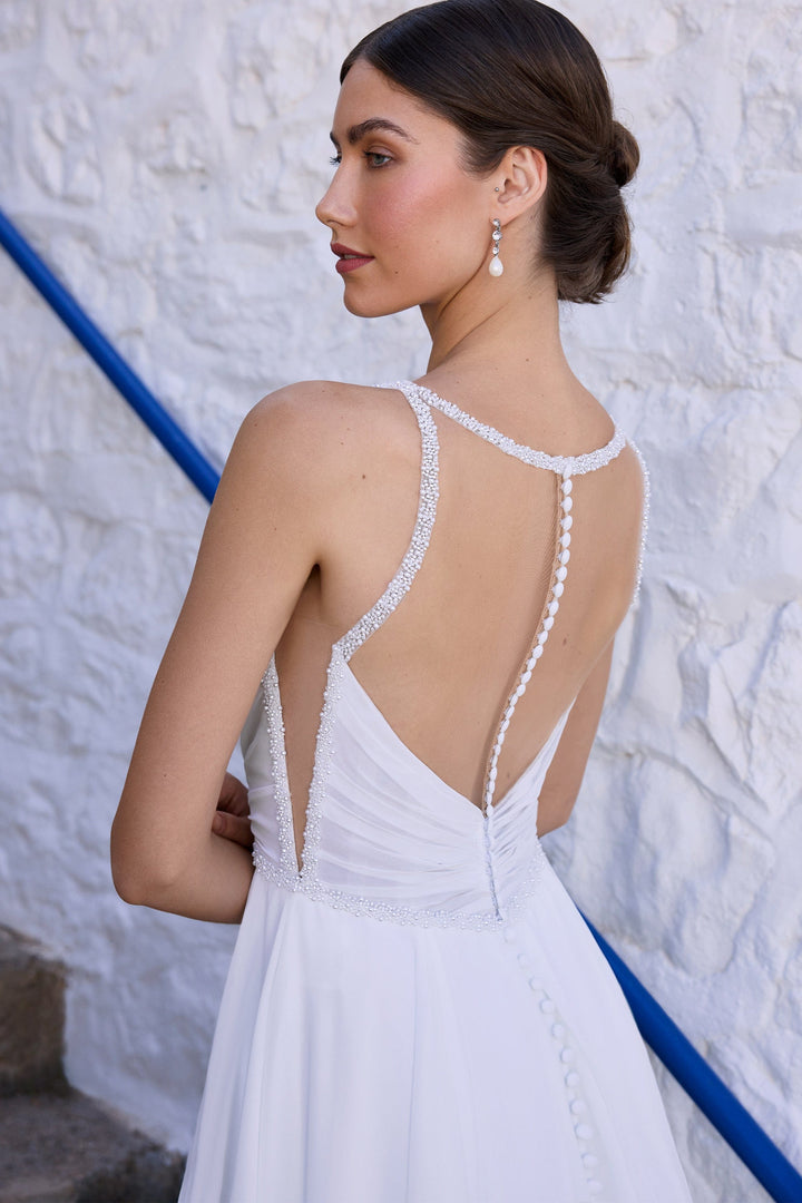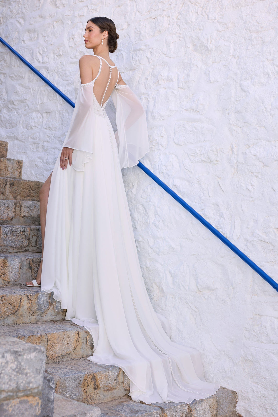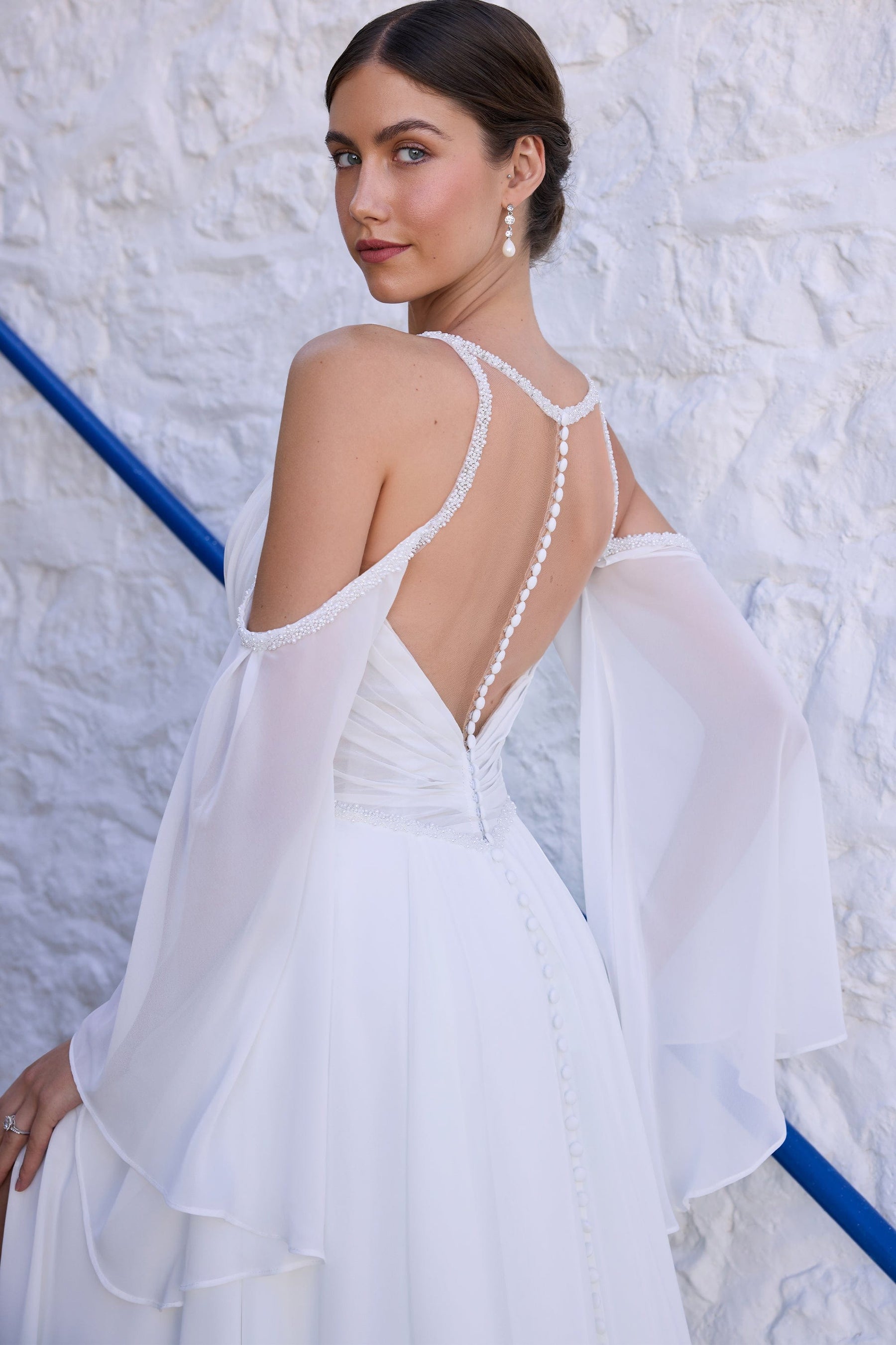 Elevate your romantic look with Sophia Tolli's Abby - the bohemian wedding dress of your dreams with a daring skirt slit. Abby is a timeless gown, adorned with elegant beading and a deep V-neckline that continues to the back bodice, revealing an illusion low back with fabric-covered buttons for a modern touch. The ruched bodice draws the eye to the natural waistline, creating a flattering silhouette, and the detachable cold shoulder bell sleeves add a unique cold-shoulder neckline, adding to the sophistication of this boho wedding dress. The A-line silhouette flows gracefully with every movement, while the chic skirt slit adds a touch of effortless beauty to Abby.